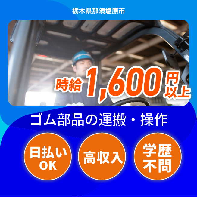 ◆日払い・仮払いOK(アプリでカンタン申請!) 交通費 支給あり 応募の流れ 本ページ内<応募する>ボタンより、必要項目をご入力の上、ご応募ください。 勤務地 【勤務地】栃木県那須塩原市上中野 勤務時間 【勤務地】8:15~16:35(休憩60分)