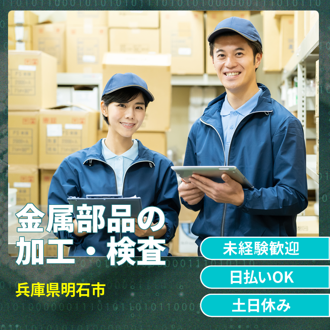 給与詳細 月収例 270,000円 日給例 11,456円 勤務地 兵庫県明石市 仕事内容 【金属部品の加工・検査(入出荷前の検品・製品の洗浄など)】