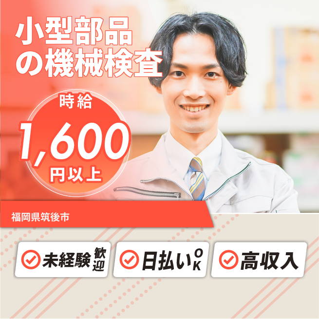 給与詳細 月収例 270,000円 時給例 1,688円 勤務地 福岡県筑後市 仕事内容 【小型部品の機械検査・目視チェック】
