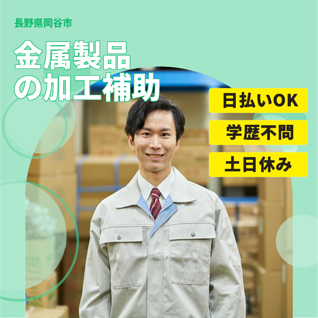 給与詳細 月収例 250,000円 日給例 10,400円 勤務地 長野県岡谷市 仕事内容 【土日祝休み/深夜時給1625円/金属製品の加工補助/夜勤専属】