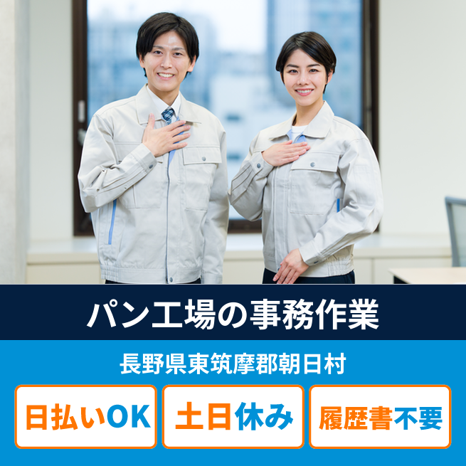 給与詳細 月収例 180,000円 時給例 1,100円 勤務地 長野県東筑摩郡朝日村 仕事内容 【業務内容】パン工場での事務作業