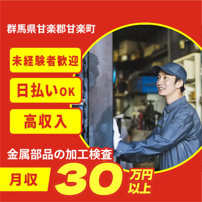 給与詳細 年収例 4,080,000円 月収例 340,000円 勤務地 群馬県甘楽郡甘楽町 仕事内容 【業務内容】自動車部品の加工と検査
