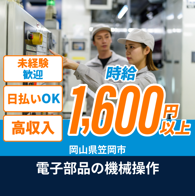 給与詳細 月収例 270,000円 時給例 1,688円 勤務地 岡山県笠岡市 仕事内容 【小型電子部品の製造】