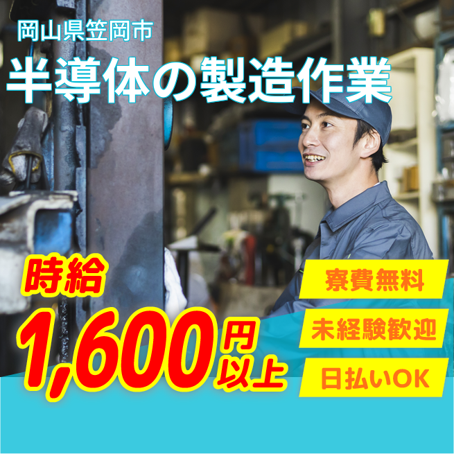 給与詳細 月収例 270,000円 時給例 1,688円 勤務地 岡山県笠岡市 仕事内容 【半導体の製造(機械のセット・操作など)】