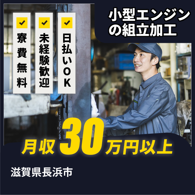 給与詳細 月収例 310,000円 日給例 12,080円 勤務地 滋賀県長浜市 仕事内容 【小型エンジンのネジ締め・部品のはめ込み】