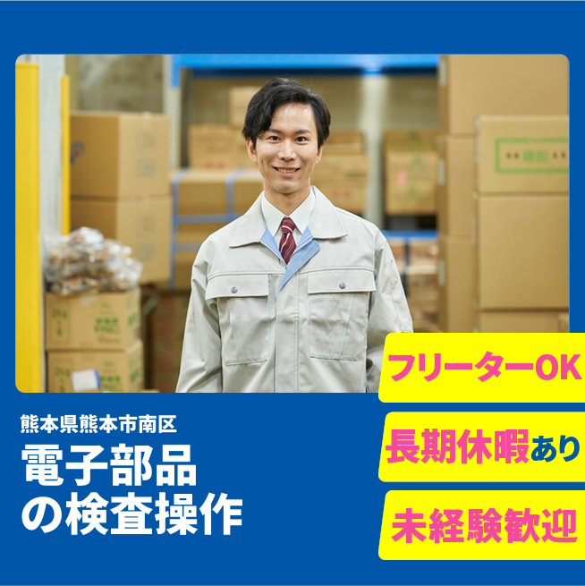 給与詳細 月収例 240,000円 日給例 10,400円 勤務地 熊本県熊本市南区 仕事内容 【電子部品の検査・スイッチ操作】