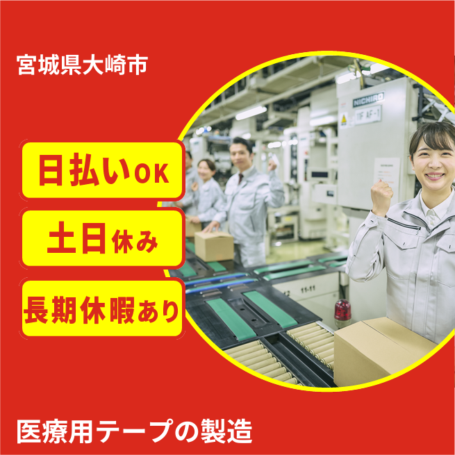 給与詳細 月収例 280,000円 日給例 10,480円 勤務地 宮城県大崎市 仕事内容 【医療テープの製造】