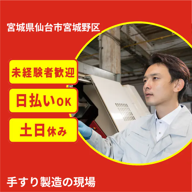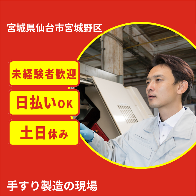 ◆日払い・仮払いOK(アプリでカンタン申請!) 交通費 支給あり 応募の流れ 本ページ内<応募する>ボタンより、必要項目をご入力の上、ご応募ください。 勤務地 【勤務地】宮城県仙台市宮城野区- 勤務時間 【勤務地】8:30~19:00(休憩45分+小休憩15分)