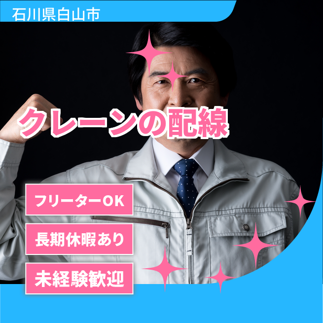 給与詳細 月収例 250,000円 日給例 12,080円 勤務地 石川県白山市 仕事内容 【クレーンの配線】