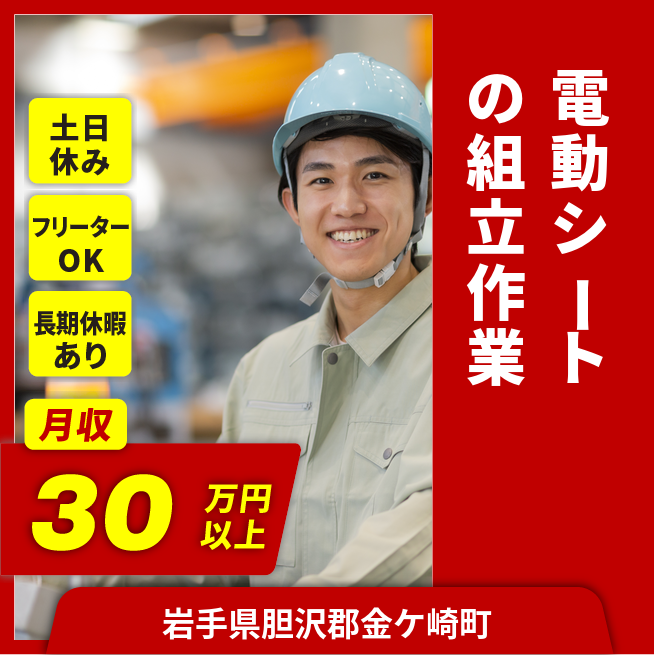 給与詳細 月収例 320,000円 日給例 11,200円 勤務地 岩手県胆沢郡金ケ崎町 仕事内容 【業務内容】自動車シートの部品組立とカバーの取り付け作業