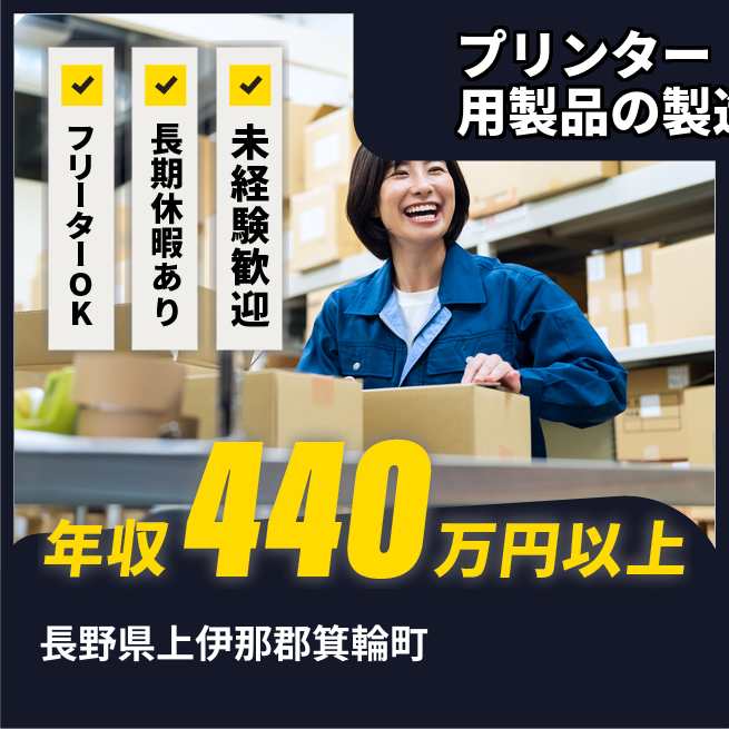 給与詳細 年収例 4,320,000円 月収例 360,000円 勤務地 長野県上伊那郡箕輪町 仕事内容 【プリンター用製品の製造】
