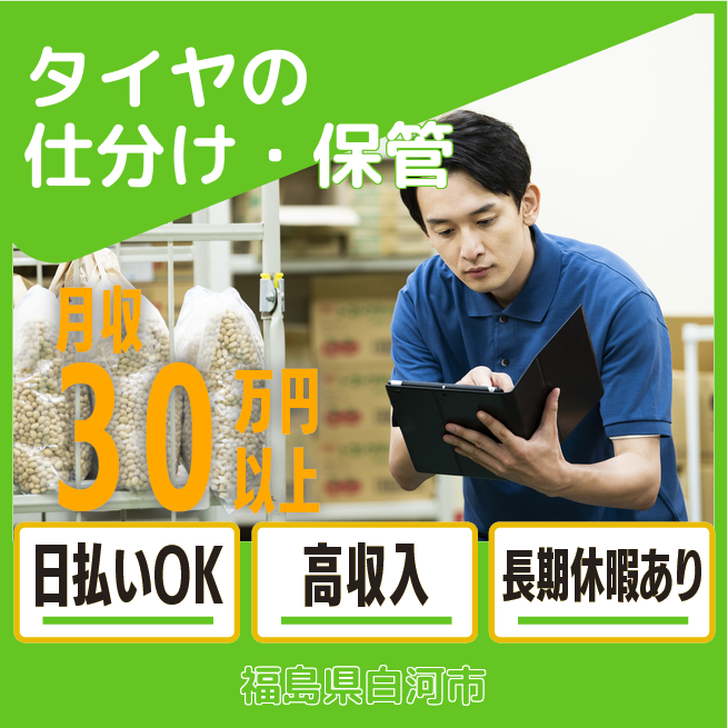 給与詳細 月収例 320,000円 時給例 1,750円 勤務地 福島県白河市 仕事内容 【タイヤの仕分け・保管】