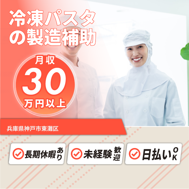 給与詳細 月収例 300,000円 日給例 10,800円 勤務地 兵庫県神戸市東灘区 仕事内容 【冷凍パスタの製造補助(原料の投入など)】