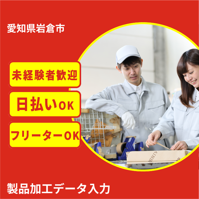 給与詳細 月収例 240,000円 日給例 12,000円 勤務地 愛知県岩倉市 仕事内容 【入力だけの簡単操作】