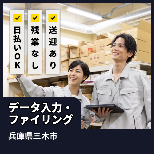 給与詳細 月収例 240,000円 日給例 11,840円 勤務地 兵庫県三木市 仕事内容 【データ入力・ファイリング】
