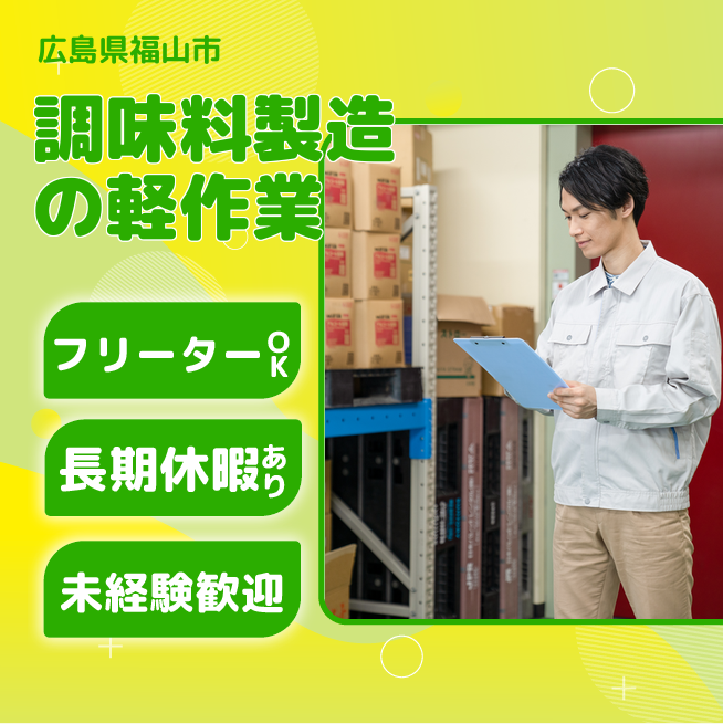 給与詳細 月収例 260,000円 時給例 1,240円 勤務地 広島県福山市 仕事内容 【業務内容】調味料や香辛料の製造工場での製品加工と包装