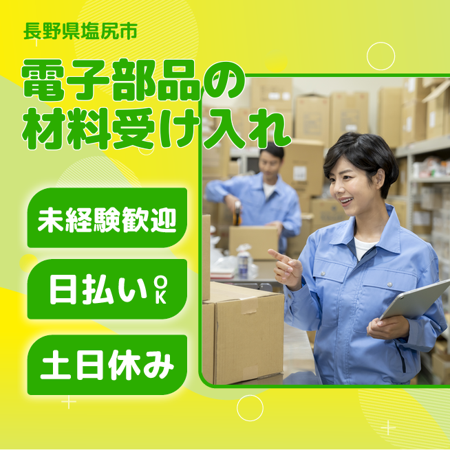 給与詳細 月収例 210,000円 時給例 1,200円 勤務地 長野県塩尻市 仕事内容 【電子部品の材料受け入れ・出荷準備】