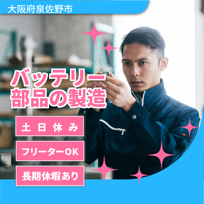給与詳細 月収例 230,000円 日給例 11,200円 勤務地 大阪府泉佐野市 仕事内容 【バッテリー部品の製造】