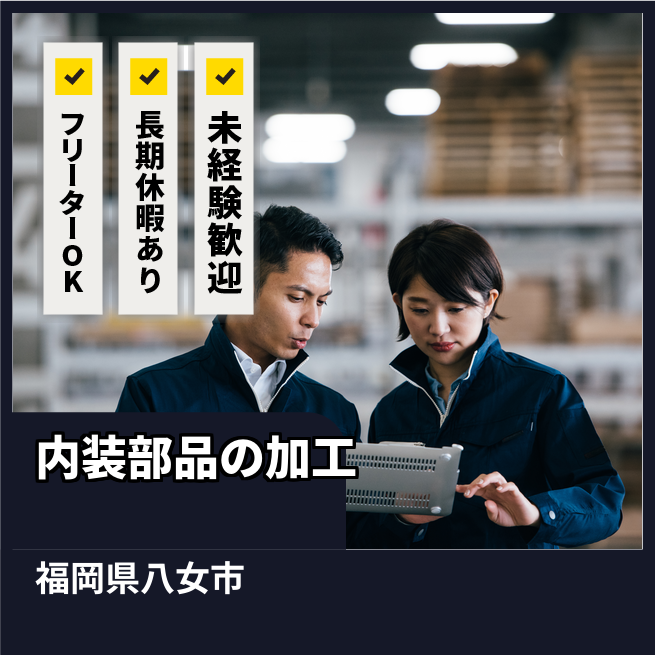 給与詳細 月収例 290,000円 時給例 1,200円 勤務地 福岡県八女市 仕事内容 【業務内容】車用内装部品の製造と品質管理