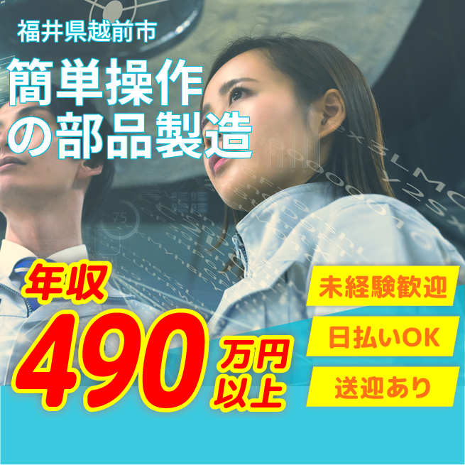 給与詳細 年収例 4,920,000円 月収例 410,000円 勤務地 福井県越前市 仕事内容 【業務内容】 スマホの部品製造における機械操作業務