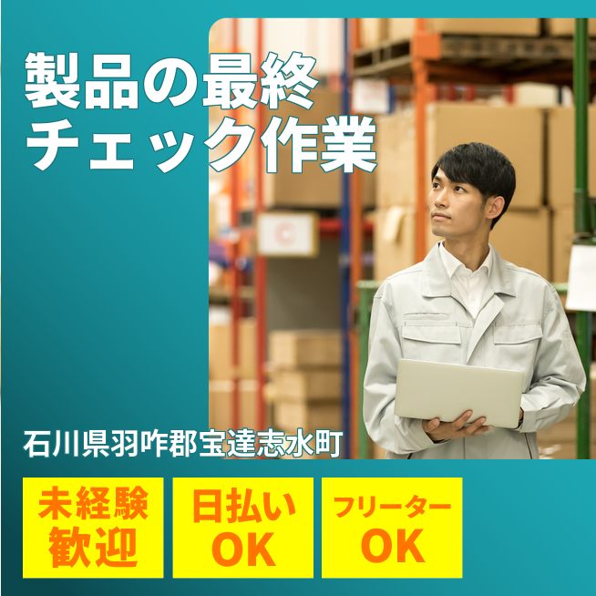 給与詳細 月収例 260,000円 日給例 10,480円 勤務地 石川県羽咋郡宝達志水町 仕事内容 【業務内容】