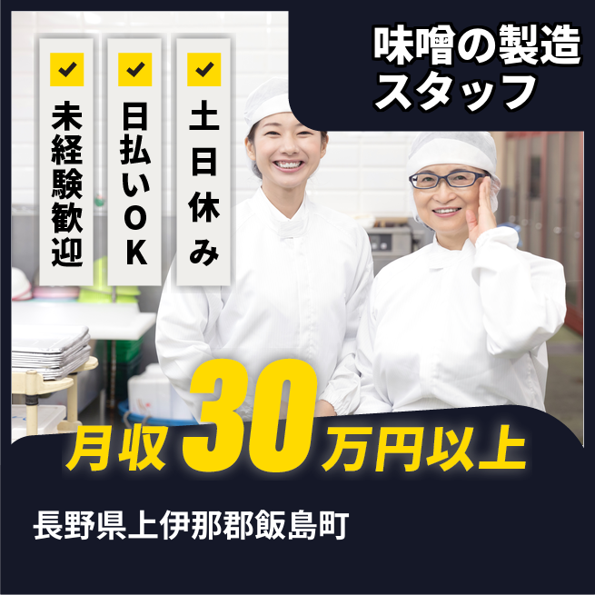 ・受動喫煙対策あり、詳細は面接時にお伝えします。 公開日 2025年10月01日 【味噌の製造(材料選別・投入・梱包)】