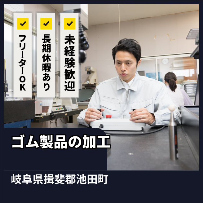 給与詳細 月収例 260,000円 日給例 10,800円 勤務地 岐阜県揖斐郡池田町 仕事内容 【業務内容】 ゴム製品の製造工場での作業