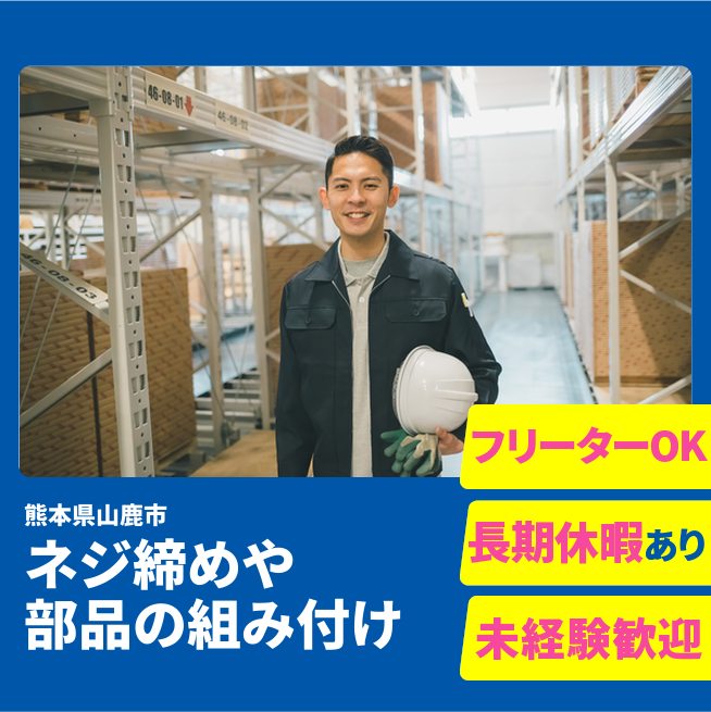 給与詳細 月収例 240,000円 日給例 10,400円 勤務地 熊本県山鹿市 仕事内容 【ネジ締めや部品の組み付け】
