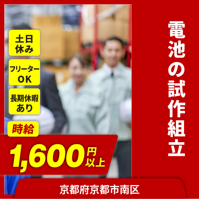 給与詳細 月収例 260,000円 時給例 1,600円 勤務地 京都府京都市南区 仕事内容 【電池の試作】