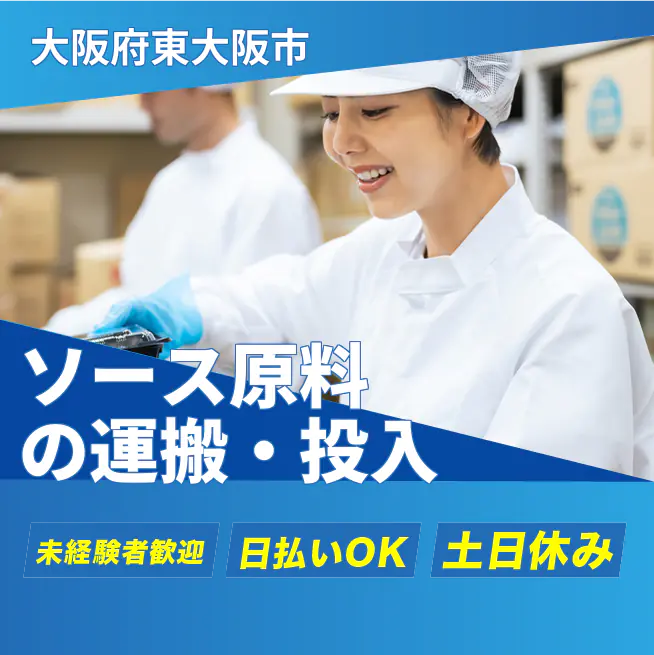 ◆日払い・仮払いOK(アプリでカンタン申請!) 交通費 支給あり 応募の流れ 本ページ内<応募する>ボタンより、必要項目をご入力の上、ご応募ください。 勤務地 【勤務地】大阪府東大阪市鴻池徳庵町 勤務時間 【勤務地】9:00~17:00(休憩60分/12:00~)