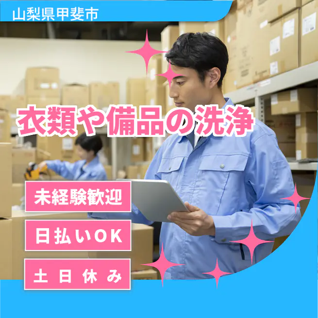 給与詳細 月収例 250,000円 日給例 10,400円 勤務地 山梨県甲斐市 仕事内容 【衣類や備品の洗浄(機械の操作・備品の解体・入出荷作業)】
