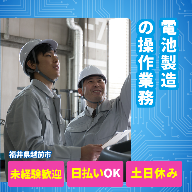 給与詳細 月収例 200,000円 時給例 1,210円 勤務地 福井県越前市 仕事内容 【業務内容】電池製造工場での原料投入や機械操作を行う仕事