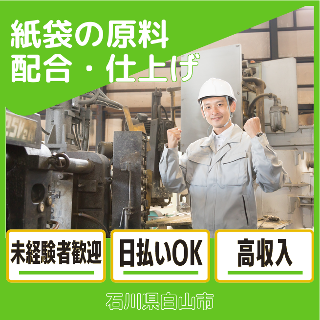 給与詳細 月収例 220,000円 日給例 11,200円 勤務地 石川県白山市 仕事内容 【紙袋の製造(原料の配合・仕上げ作業)】