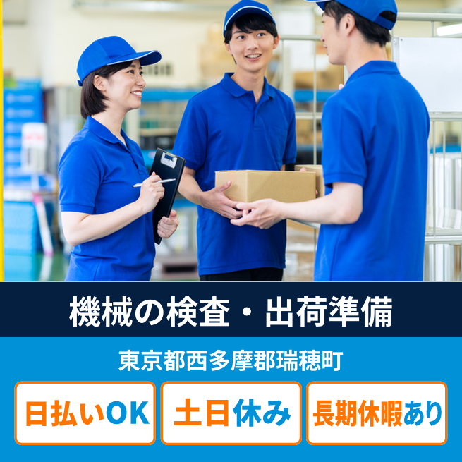 ◆日払い・仮払いOK(アプリでカンタン申請!) 交通費 支給あり 応募の流れ 本ページ内<応募する>ボタンより、必要項目をご入力の上、ご応募ください。 勤務地 【勤務地】東京都西多摩郡瑞穂町- 勤務時間 【勤務地】9:00~17:30(休憩45分+小休憩5分×2回)