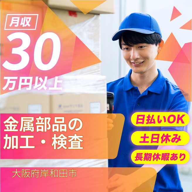 給与詳細 月収例 300,000円 日給例 11,600円 勤務地 大阪府岸和田市 仕事内容 【金属部品の加工・検査】