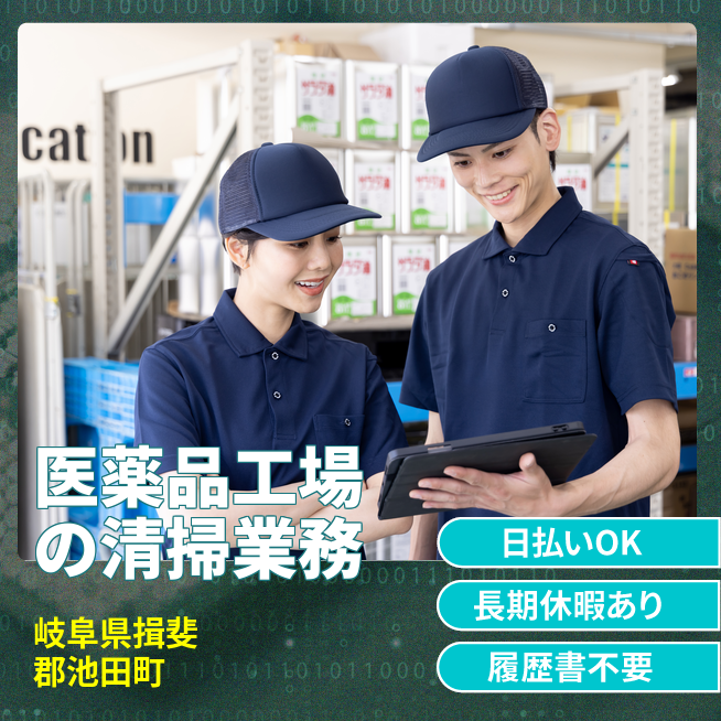 インフルエンザ用医薬品を製造する工場における清掃と書類配布の業務です。