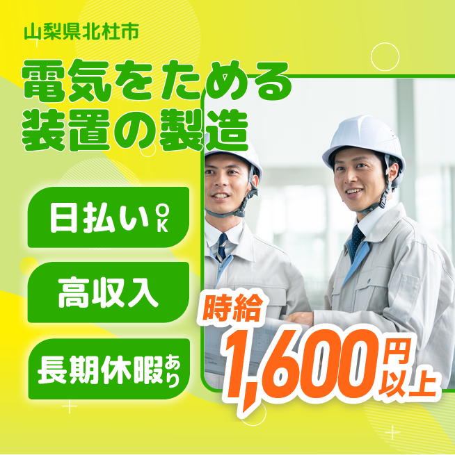 給与詳細 月収例 280,000円 時給例 1,600円 勤務地 山梨県北杜市 仕事内容 【蓄電池用の金属パーツ製造】