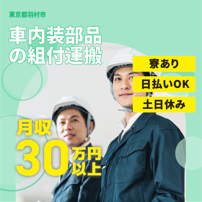 給与詳細 月収例 300,000円 日給例 12,000円 勤務地 東京都羽村市 仕事内容 【自動車ドアの内装部品の組付け・運搬】