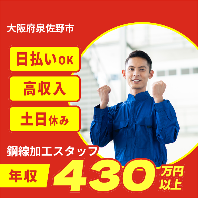 給与詳細 年収例 4,320,000円 月収例 360,000円 勤務地 大阪府泉佐野市 仕事内容 【業務内容】