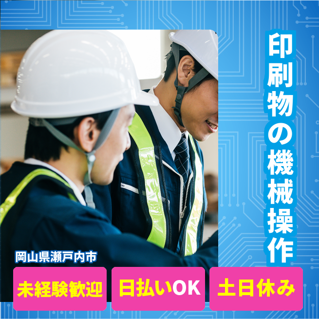 給与詳細 月収例 220,000円 時給例 1,150円 勤務地 岡山県瀬戸内市 仕事内容 【業務内容】印刷物の加工と機械操作