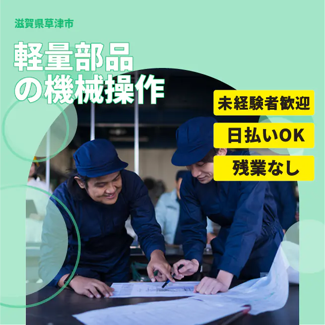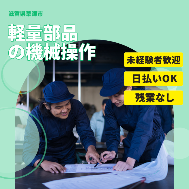 給与詳細 月収例 240,000円 日給例 11,200円 勤務地 滋賀県草津市 仕事内容 【業務内容】プラスチック部品の成型加工