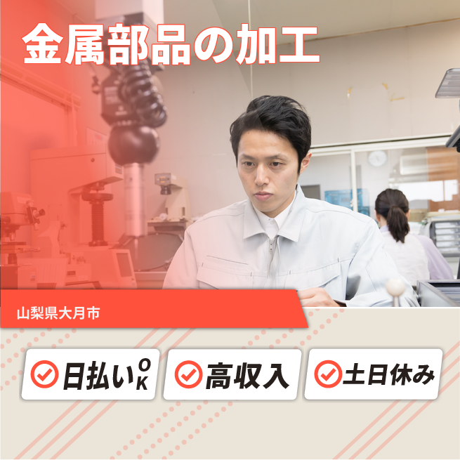 給与詳細 月収例 260,000円 日給例 11,200円 勤務地 山梨県大月市 仕事内容 【金属部品の加工】