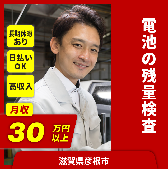 給与詳細 月収例 310,000円 時給例 1,750円 勤務地 滋賀県彦根市 仕事内容 【電池の残量チェック】