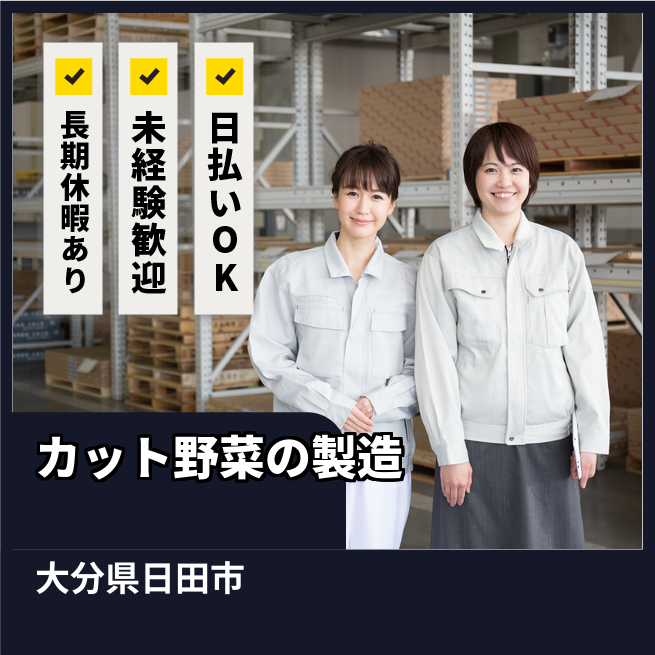 給与詳細 月収例 240,000円 時給例 1,150円 勤務地 大分県日田市 仕事内容 【カット野菜の製造】