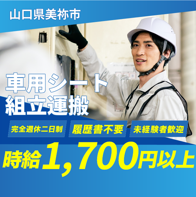 給与詳細 月収例 270,000円 日給例 13,500円 勤務地 山口県美祢市 仕事内容 自動車シート部品の組み立て、製品の運搬業務です。未経験スタート可能。