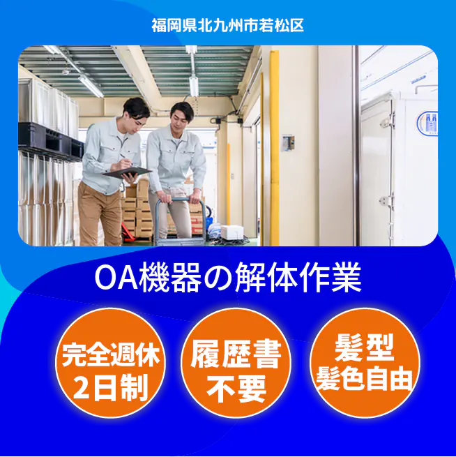給与詳細 月収例 175,000円 時給例 1,150円 勤務地 福岡県北九州市若松区 仕事内容 【業務内容】OA機器の分解・分別作業
