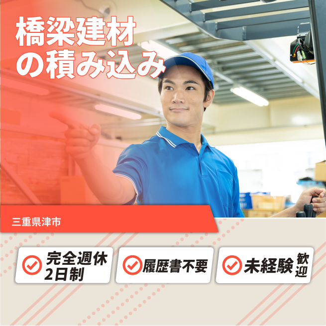 給与詳細 月収例 216,000円 日給例 10,800円 勤務地 三重県津市 仕事内容 【業務内容】橋梁資材の出荷と包装、フォークリフトでの積み込み業務