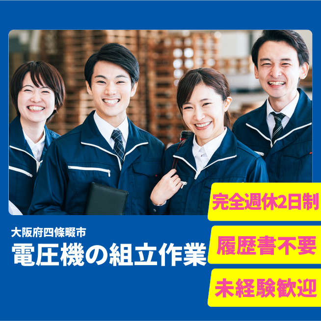 給与詳細 月収例 253,500円 日給例 10,400円 勤務地 大阪府四條畷市 仕事内容 【業務内容】電圧機の組立と運搬作業