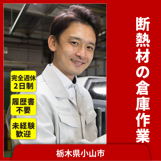 給与詳細 月収例 192,000円 時給例 1,250円 勤務地 栃木県小山市 仕事内容 資材倉庫にて高さ1メートルほどの断熱材を積み上げる作業、段ボールに梱包する作業。