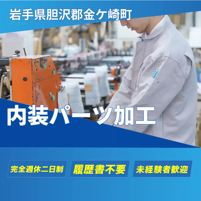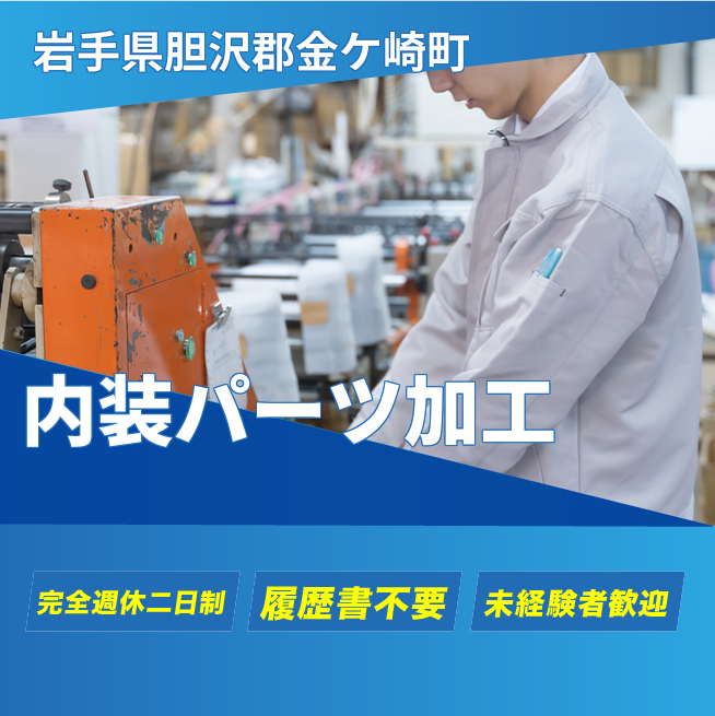 給与詳細 月収例 227,500円 時給例 1,600円 勤務地 岩手県胆沢郡金ケ崎町 仕事内容 【業務内容】自動車内装部品の組付けと加工を行います。